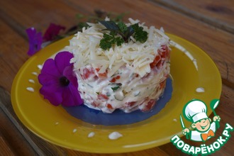 Затем слой яиц и снова слой майонеза. Потом слой сыра и снова майонез. И вконце слой яблок. Аккуратно смазываем наш салатный тортик сверху и по бокам майонезом и ставим в холодильник для застывания на 10 мин. По желанию сверху украсить колечками маслин или ягодами клюквы. А если использовать лeгкий майонез, то и салатик будет наилегчайший.