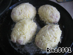 Только после того, как котлеты сформированы (это важно!), приступаем к терке картофеля - чтобы масса не потемнела, от "долгого ожидания". Я использовала крупную терку. Отжать лишнюю жидкость, добавить 2 яйца, соль, перец, хорошо перемешать. Котлету обвалять в муке, затем во взбитом яйце и, сложив руки "лодочкой" равномерно по всей котлете разложить картофельную массу, плотно прижимая руками (желательно делать это над раковиной или какой-то емкостью - так как с картофеля будет отжиматься излишняя жидкость).