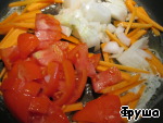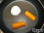Половинку лука и моркови обжарить на сухой сковороде и добавить в бульон.