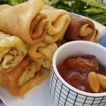 4 )Выпекать на сковороде с одной стороны, подавать с начинками 1. Творожная с тeртым шоколадом