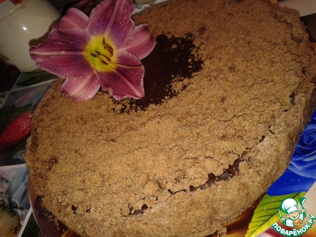 В эту смесь постепенно ввести шоколад, размешивая до однородности. Добавить масло, размешать до однородности. Вылить смесь в приготовленную основу, дать остыть.