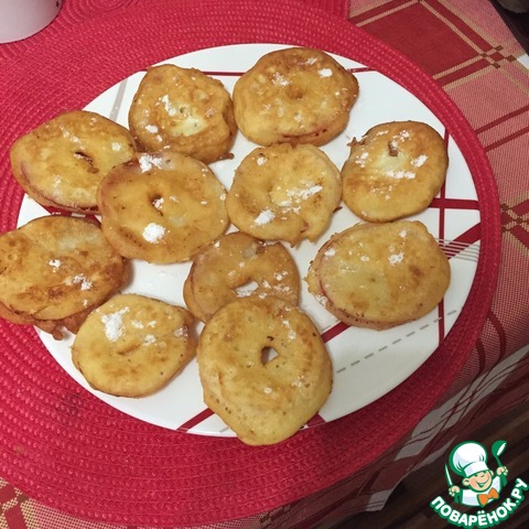 • Каждое яблочное колечко обмакнуть в кляр и положить на сковороду с разогретым маслом.