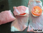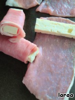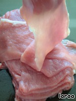 Для начала карбонат нужно нарезать. Очень, очень тонко в длину, примерно 0,5 см толшиной. Я, по просила об этом мясника и он любезно, с помощью машины для нарезки. быстренько это сделал. Если таковая машина или любезный мясник отсутствует, то мясо слегка подморозить, затем нарезать ножом так тонко, как можете только. Положить на доску, постелить сверху пищевую пленку и постучите тяжелой сковородой, чтобы стало тоньше. Проверено - работает.