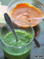 Теперь очередь за маринадами. Для первого маринада –йогурт смешать с томатной пастой, розмарином, чили, солью, перцем и немного медом. Попробуйте на вкус. Должно быть чуть-чуть пикантнее, чем если бы вы ели это ложкой. Для второго варианта- свежий базилик, петрушка, чеснок, чили, соль, перец положить в баночку и залить раст. маслом и пропустить блендером. Должно быть не очень жидко ну и не очень густо.