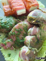 Теперь приступим так сказать к сборке. Положите мясо на стол и разложите начинку и заверните. В первом варианте это будет фета. Смажьте маринадом с йогуртом и розмарином.