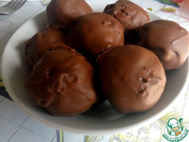 Растопить в микро шоколад. Полностью окунать шарики в шоколад (наколоть их на зубочистку и окунуть). Дать излишкам шоколада немного стечь и положить пироженки опять на бумагу. Я попробовала как молочный шоколад