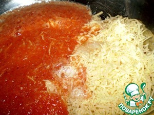Разрыхлитель развести в томатном соке, пойдет реакция. Смешать сыр и томатный сок. -