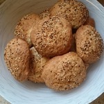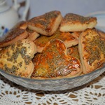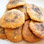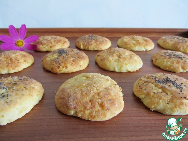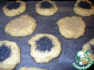 Выложить лепешечки на расстоянии! Иначе в процессе выпекания они, расползаясь, попытаются соединиться друг с другом... Посыпать по вкусу зeрнышками.