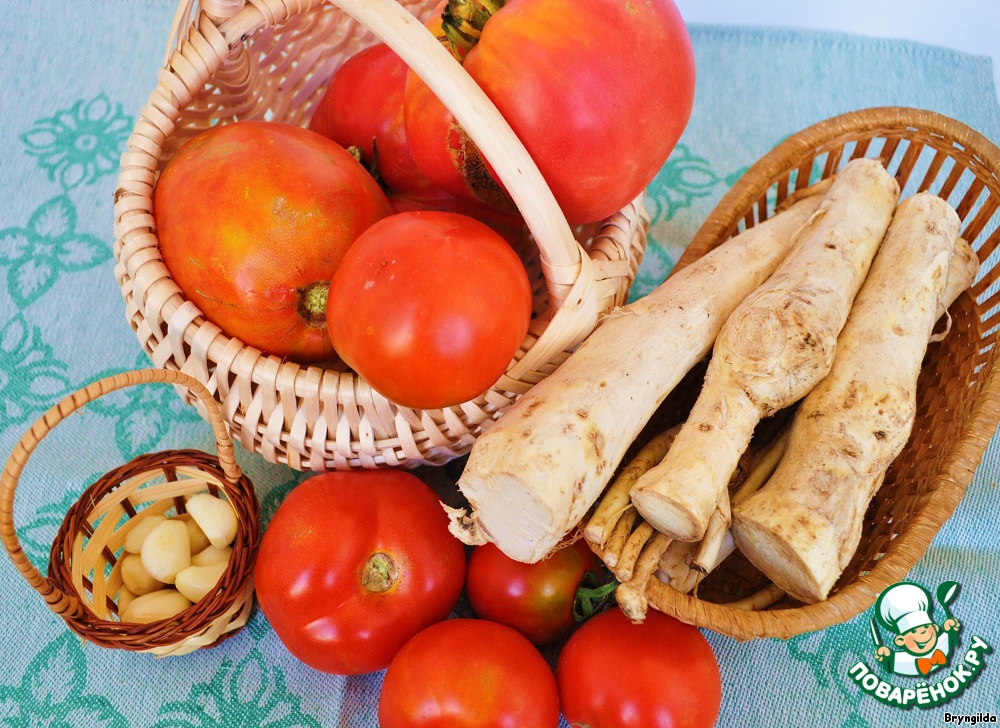 Помидоры вымыть, хрен очистить ( на фото еще не чищеный) чеснок почистить и жгучий перчик чили помыть. Внимание! Если из перца чили удалить семена, то он будет менее жгучим!