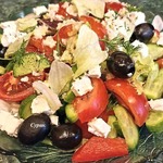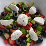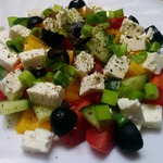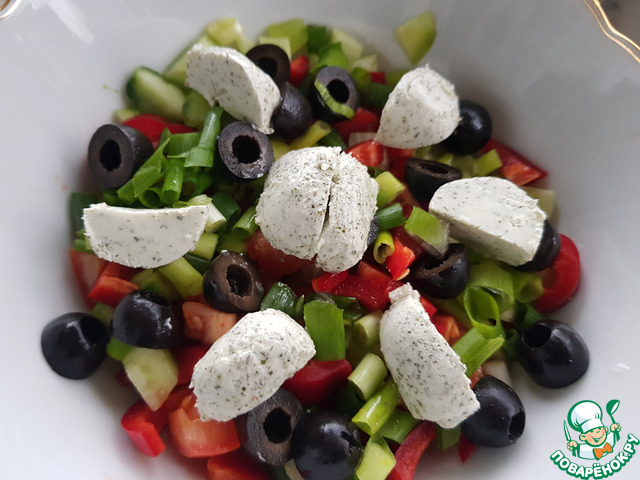 3) Помидоры, огурцы, маслины, лук, перец перемешать. Залить заправкой и ещe раз перемешать.