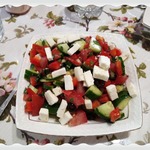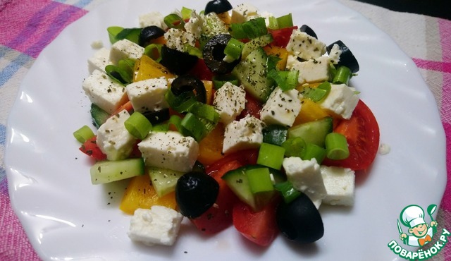 1) Помидоры нарезать крупными дольками; огурец-вдоль, затем полукружками; перец-соломкой; маслины-кольцами.