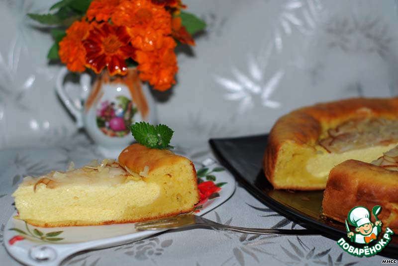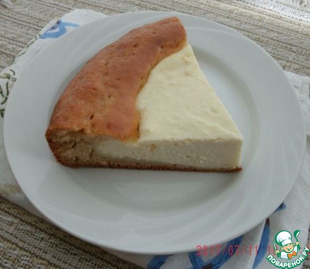 Вся прелесть этой чудо ватрушки в том, что при выпекании творожная начинка опускается вниз, а бисквит поднимается, образуя бортики. Таким образом, получаем нежнейшую творожную начинку в воздушной бисквитной кайме с хрустящей корочкой! Любители творога, этот пирог для Вас!