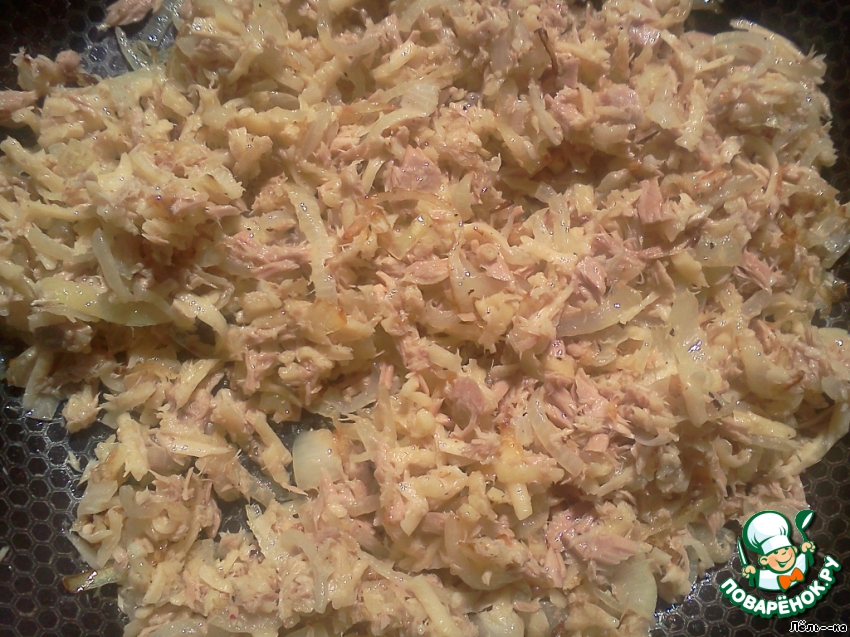 В остывший лук с чесноком добавляем тертый сыр, тунец (слить масло), перец по вкусу.