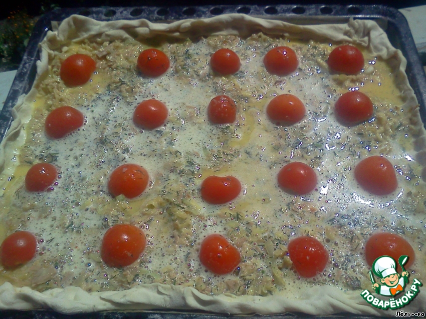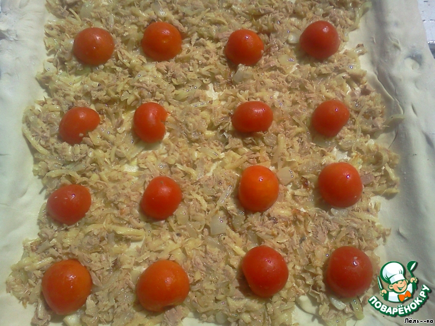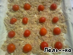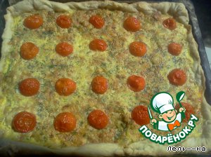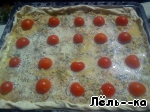 Все выкладываем на тесто ровным слоем, сверху украшаем разрезанными пополам помидорами черри.
