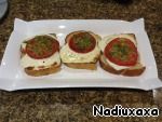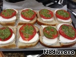 Духовку ставим греться до 200С. Хлеб слегка обжариваем на сухой сковороде, чтобы подрумянился и раскладываем на противень. Сверху моцареллу, на сыр- помидор и песто, ...