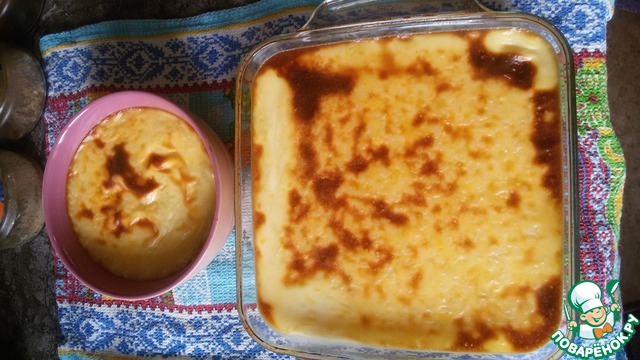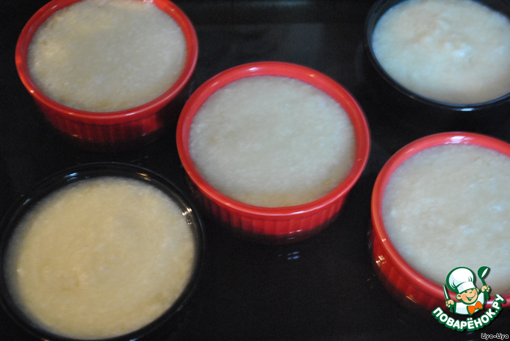 Сютлач разливаем по жароупорным формам. Когда у меня не было формочек, я выпекала сютлач в большой стеклянной форме - получалось не менее вкусно :) ставим на противень с водой (делаем водяную баню) и в духовку при 200 С до золотистой корочки, это около 30 минут.