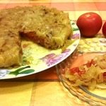 Сочетание солено-перченых помидор и сладкого лука очень необычное и непривычное, однако тарт был полностью съеден. Режется прекрасно, кусочки не крошатся. Делала с желтыми помидорами, фото прилагаю.