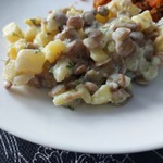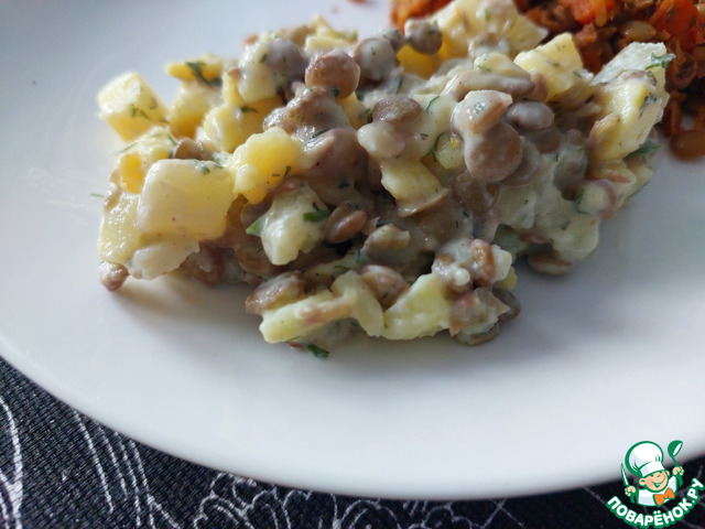 Вкусный, питательный картофельный салат с чечевицей и ананасом. Ананас богат триптофаном – аминокислотой, которая является предшественником серотонина - гормоном радости. Нам ведь хорошее настроение не помешает, правда.