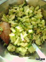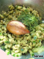Аккуратно перемешать картофель, огурцы, авокадо и добавить нарезанный укроп.