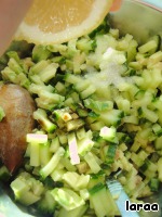 Авокадо так же нарезать и сбрызнуть лимонным соком. Оставьте косточку от авокадо в чашечке до последнего момента, так авокадо дольше не потемнеет.