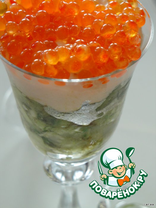 При сервировке положите в порционный стаканчик слоями. Для торжественных случаев можно украсить икрой, это не принципиально, но однозначно- вкусно.