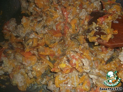 Баклажан нарезать полукольцами. Морковь натереть на крупной терке. Рук мелко нарезать. Все это обжарить на растительном масле.