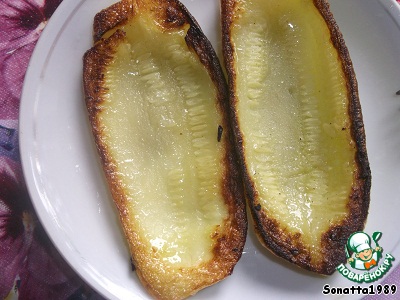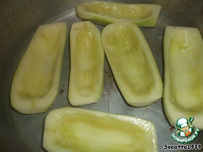 Молодые кабачки очистить от кожуры, разрезать пополам и вырезать серединку (так чтобы получились лодочки).