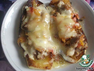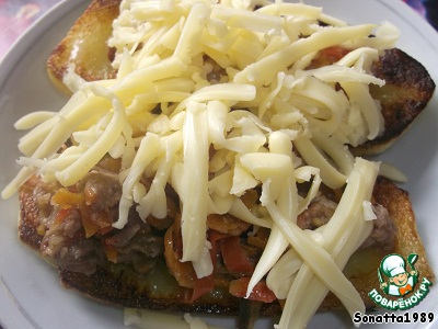 Сыр натереть на крупной терке и посыпать им лодочки с фаршем и отправить в микроволновку до расплавления сыра.
