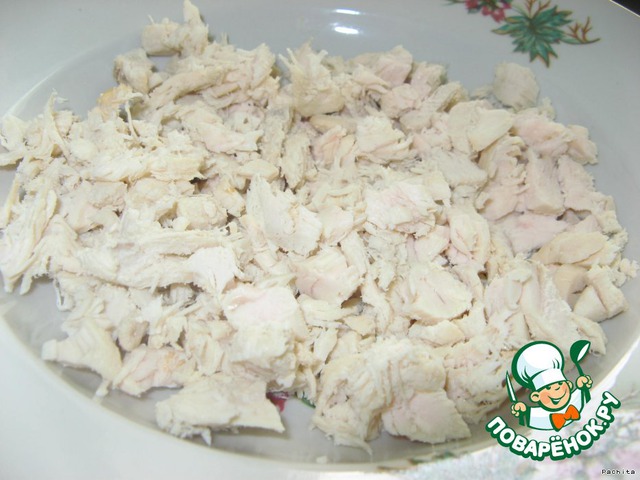 Куриное мясо нарезать или порвать на волокна.