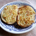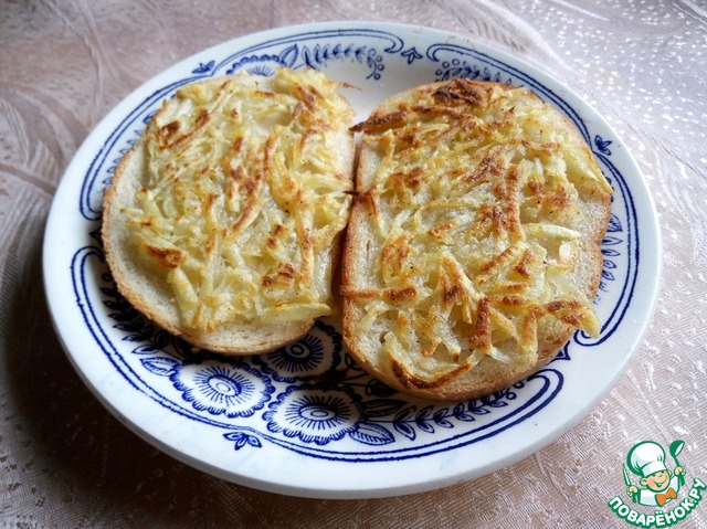 На раскаленную сковороду с растительным маслом кладем хлеб картофелем вниз и прижимаем(но не сильно). Обжариваем, проверяя, чтобы картофель не подгорел.