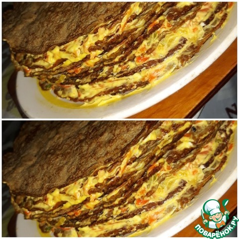 Вижу недоумeнные лица поварят, берущие в руки по тапку... Может этот рецепт печeночного тортика и покажется многочисленным повтором, но не выложить его я не могла - до чего пышен, воздушен, хоть ешь губами. Я не совсем доверяю газетным публикациям с рецептами, но попробовав один раз приготовить этот торт по данному рецепту, была приятно удивлена его нежным и неповторимым вкусом. Не менее были удивлены и мои друзья, которые с нетерпением ждут очередного праздника, отведав хоть раз эту закуску. Я старательно и добросовестно просмотрела все 40 рецептов тортов - именно такого состава нет и, на свой страх и риск быть удалeнной, угощаю таким вариантом.