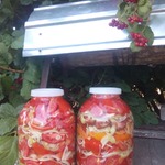 В 3 -х л. банки уложить слой смеси, слой помидоров и т. д. Влить в каждую банку по 1 ст. л. растительного масла и 3 ст. л. 9 %-го уксуса. Залить доверху оставшимся рассолом и сразу закатать или закрыть полиэтиленовыми крышками. Стерилизовать не надо. Хранить закрутку в холодильнике или в погребе.