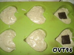 Заполняем форму на 2/3 объема.Кладем еще по кусочку шоколада и ставим выпекать минут на 20-30 при t-180 градусов.