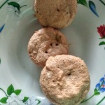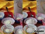 Тесто на белках обычно плохо выходит из формы, поэтому для выпечки лучше всего пользоваться бумажными манжетками или силиконовыми формами, смоченными холодной водой. Положить по 1-2 столовых ложки теста, сделать небольшое углубление в центре и положить в него по чайной ложке пудинга, к этому времени он уже немного застыл и хорошо держит форму. Я положила на дно мало теста, поэтому серединка из пудинга после выпечки оказалась на самом дне. Делайте выводы, кладите больше теста на дно. Сверху на пудинг положить еще по ложке теста. У меня получилось 8 кексов разного размера.