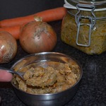 Лук порезать кубиками, морковь потереть на крупной терке, овощи немного обжарить и также пропустить с помидором через мясорубку. Всe соединить, посолить, поперчить, добавить оставшееся растительное масло и тушить 40 -50 минут, периодически помешивая на небольшом огне.