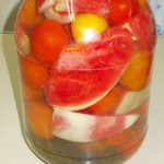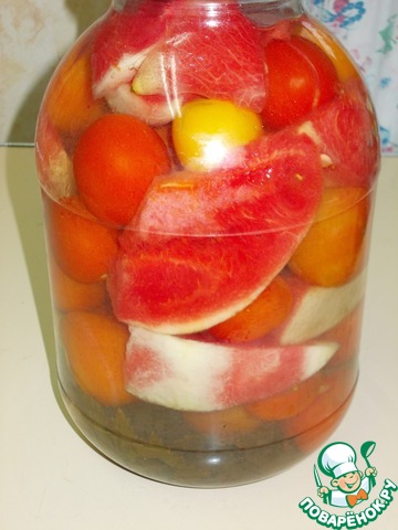 Решила попробовать и закрутить помидоры и арбузы вместе. Зимой узнаем, как на вкус.