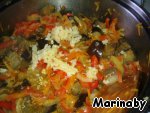 Добавить баклажаны и залить растительным маслом. Нагреть овощи и потушить их, помешивая, 20 минут.