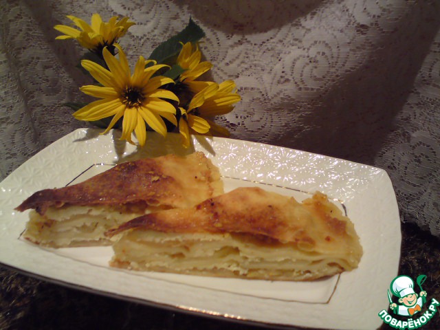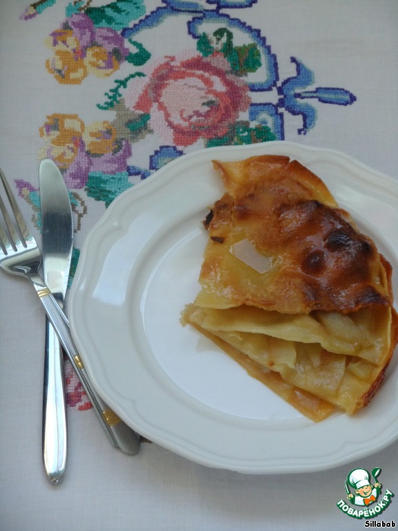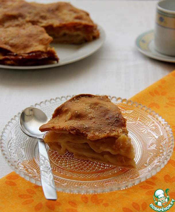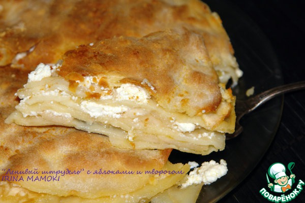 Спросите, почему такое название? Тесто как в немецком штруделе, но есть преимущества: не надо раскатывать большой тонкий пласт теста, а потом осторожно всю начинку заворачивать, переживая - порвeтся - не порвeтся. На лицо экономия времени, нервов и труда. Причем, можно использовать любую толщину начинки, любые фрукты. Пирог ставится в максимально разогретую духовку, и из смеси фруктового сока, сахара и масла получается восхитительная карамель, пропитывающая весь пирог. Советую, не пропустите этот рецепт! За рецепт огромное спасибо Елене Малаховец.