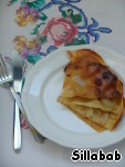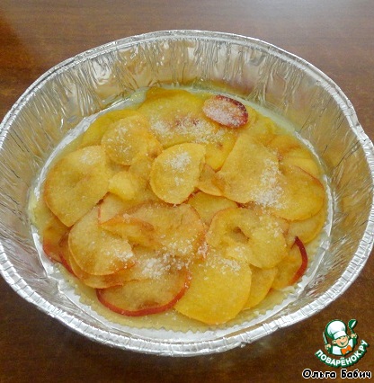Далее -второй лист, промазывая его маслом с 2-х сторон, персики, присыпая сахаром, опять лист, смазанный с 2-х сторон.