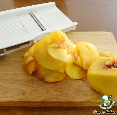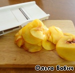 Режем тонко персики, я использовала резку, так удобнее и быстрее.