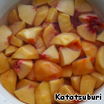 Очищенные от шкурки плоды режем произвольными кусочками и сразу же опускаем в раствор лимонной кислоты.