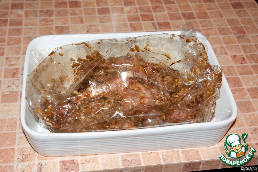 • Теперь кладите пакет в жаровню и отправляйте мариноваться в холодильник. Как я уже поясняла выше, кролика нужно мариновать не меньше суток. Если торопитесь - сделайте на ночь. У меня по стечению обстоятельств простоял полтора суток в холодильнике (2 раза в день нужно переворачивать). Думаю, от этого вкус только выиграл.