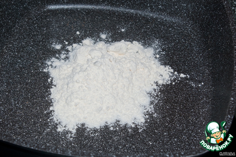 • Итак, на сухой сковороде поджарьте 2 столовых ложки муки.