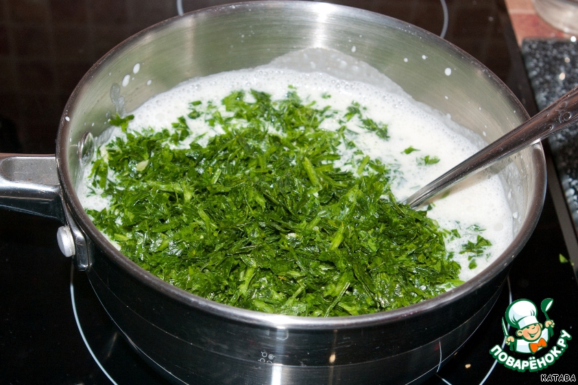 • Потом пересыпьте муку в кастрюльку, добавьте поллитра сливок, размешайте, чтобы не было комочков (хорошо использовать блендер) и нагревайте. Посолите по вкусу. Добавьте мелко рубленую зелень, соус чили, кунжут и другие пряности, размешайте и томите минут 5, не доводя до сильного кипения и постоянно помешивая.