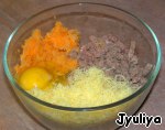 Морковь и лук измельчить блендером. Добавить к фаршу. Туда же яйцо, тертый на мелкой терке сыр. Посолить, поперчить. Тщательно перемешать.