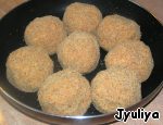 Из фарша сформировать шарики, обвалять их в панировочных сухарях. Уложить в форму, смазанную растительным маслом.