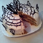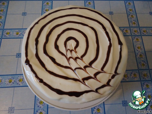 В микроволновке нагреваем до растворения шоколад и чайную ложечку сметаны, хорошо вымешиваем (сметана добавляется для того, чтобы шоколад не застывал и чтобы с ним легко было работать). Делаем бумажный кулечек, укладываем в него шоколадную массу, рисуем круги на поверхности торта. Если они получатся неровными – ничего страшного!