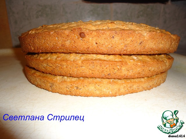 Выкладываем тесто в форму, смазанную маслом, толщиной не более 1 см. Выпекаем коржи при температуре около 220С примерно 20-25 минут.