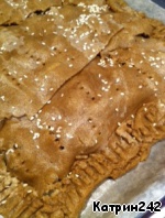 На бумаге для выпечки раскатать тесто, выложить начинку на одну из половинок, другой накрыть, вилкой придавить края, сделать проколы (чтоб пирог не лопнул), смазать водой. В этот раз сформировала по-другому, о чем потом искренне жалела, т.к. верхний слой не хотел разом переноситься на пирог, пришлось делать это частями, из-за чего внешний вид пирога очень пострадал. Получился этакий франкенштейн.