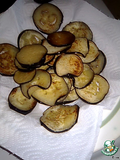Сковороду хорошенько разогреваем и порционно обжариваем баклажаны. Затем обязательно выкладываем их на бумажное полотенце, чтобы впиталось лишнее масло.